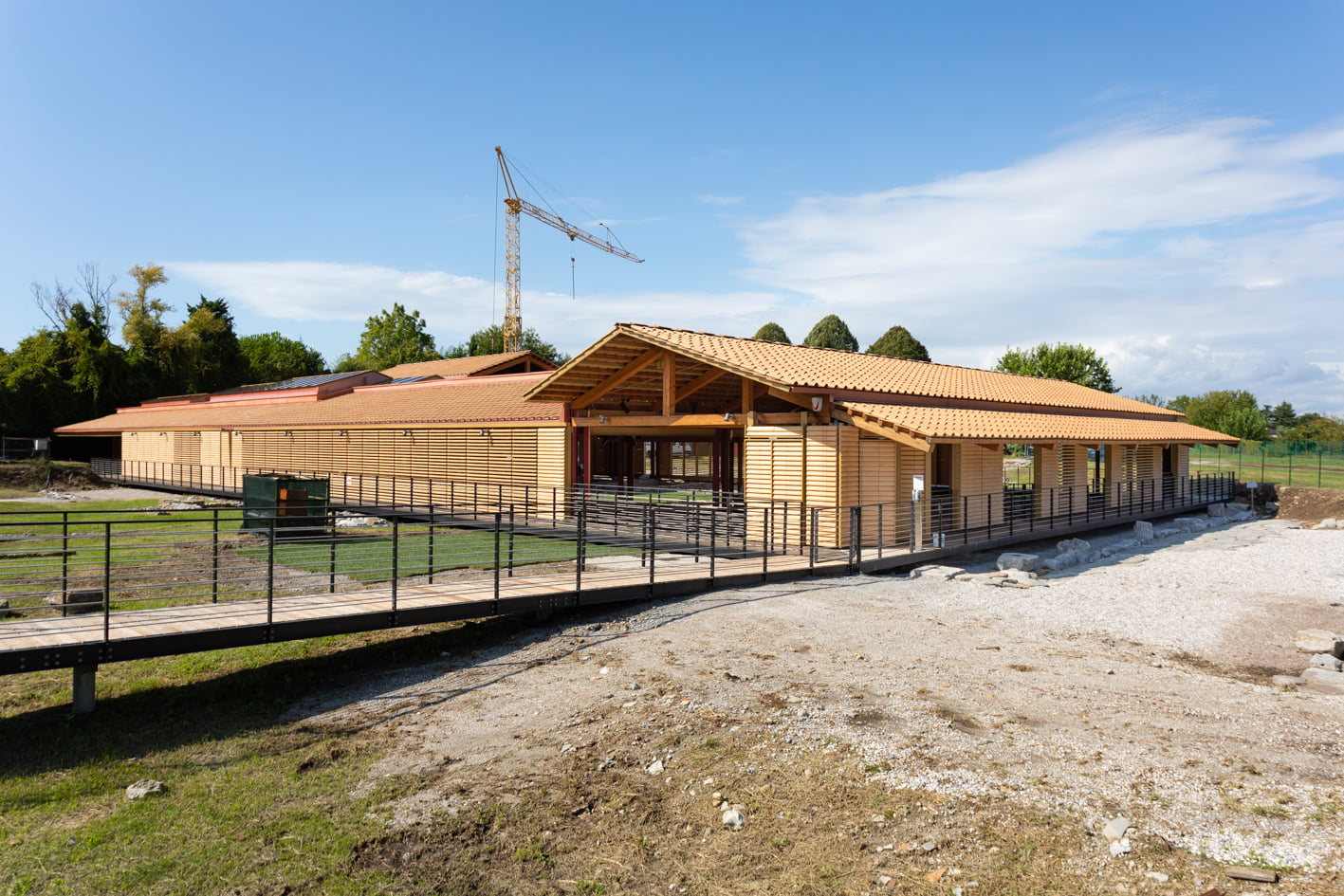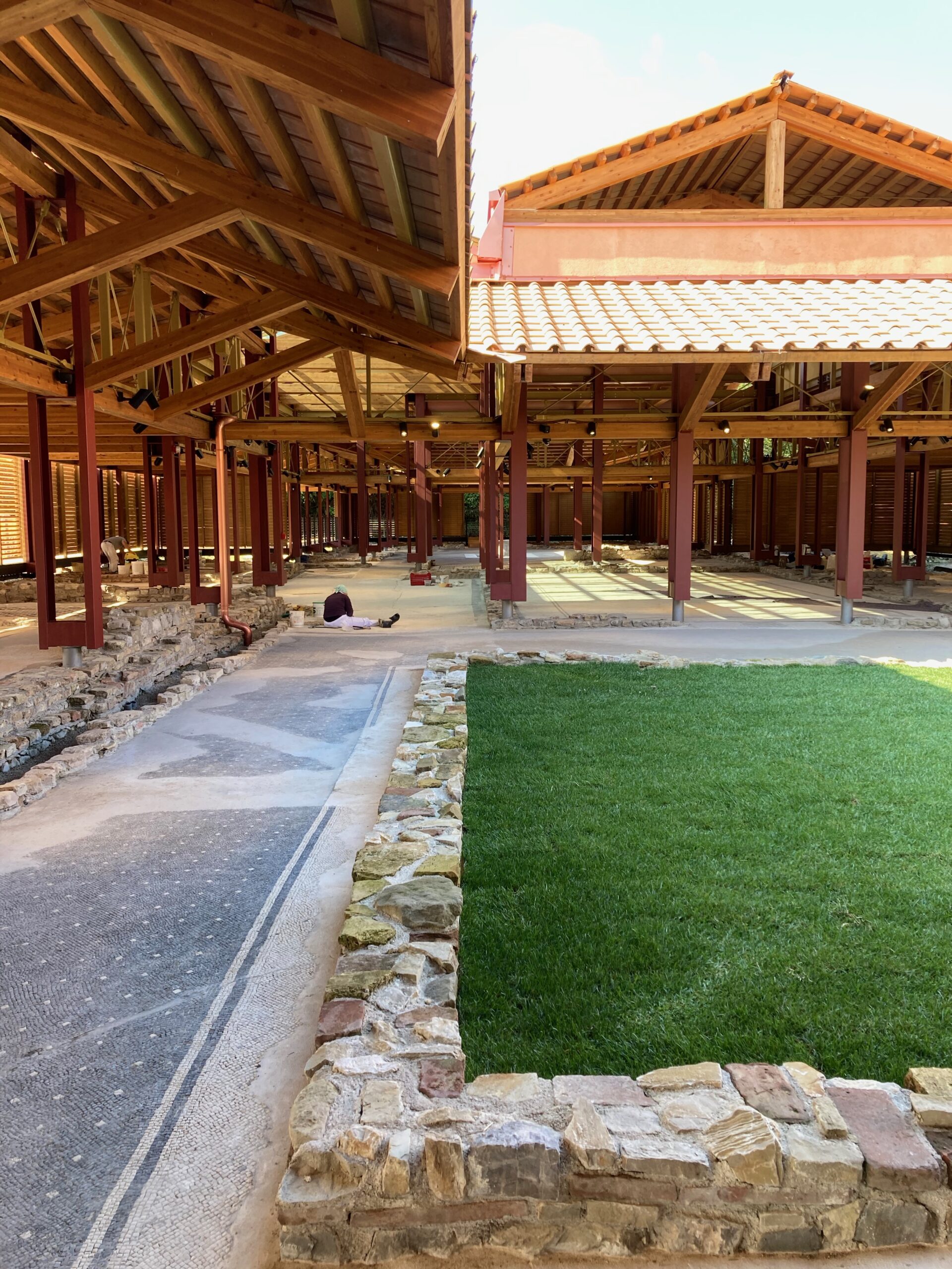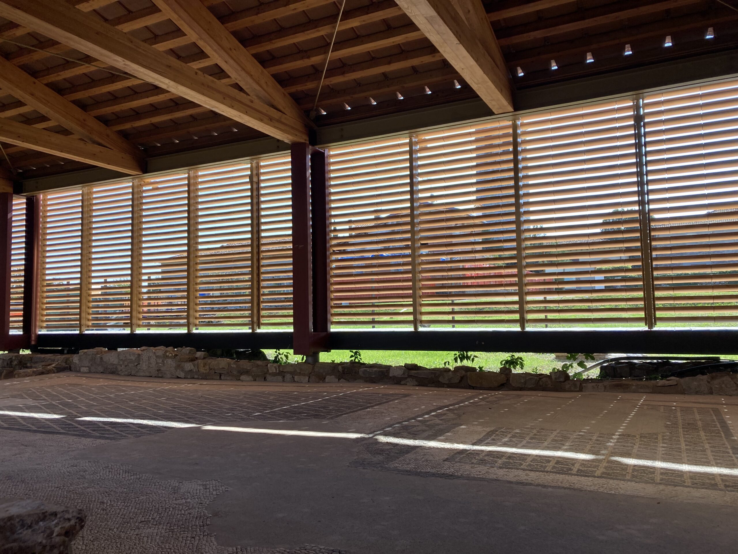 Nelle intenzioni del committente “l’elegante e agile struttura, sostenuta da pilastri d’acciaio verniciato in rosso pompeiano, allude nella sua articolazione ai volumi dell’antica domus: il tetto si compone di un’intelaiatura lignea, che sostiene la copertura in coppi e tegole, ispirati a quelli in uso in età romana, mentre ai lati la struttura è chiusa da elementi in laterizio, orientabili per una ventilazione ottimale dell’area coperta.”
