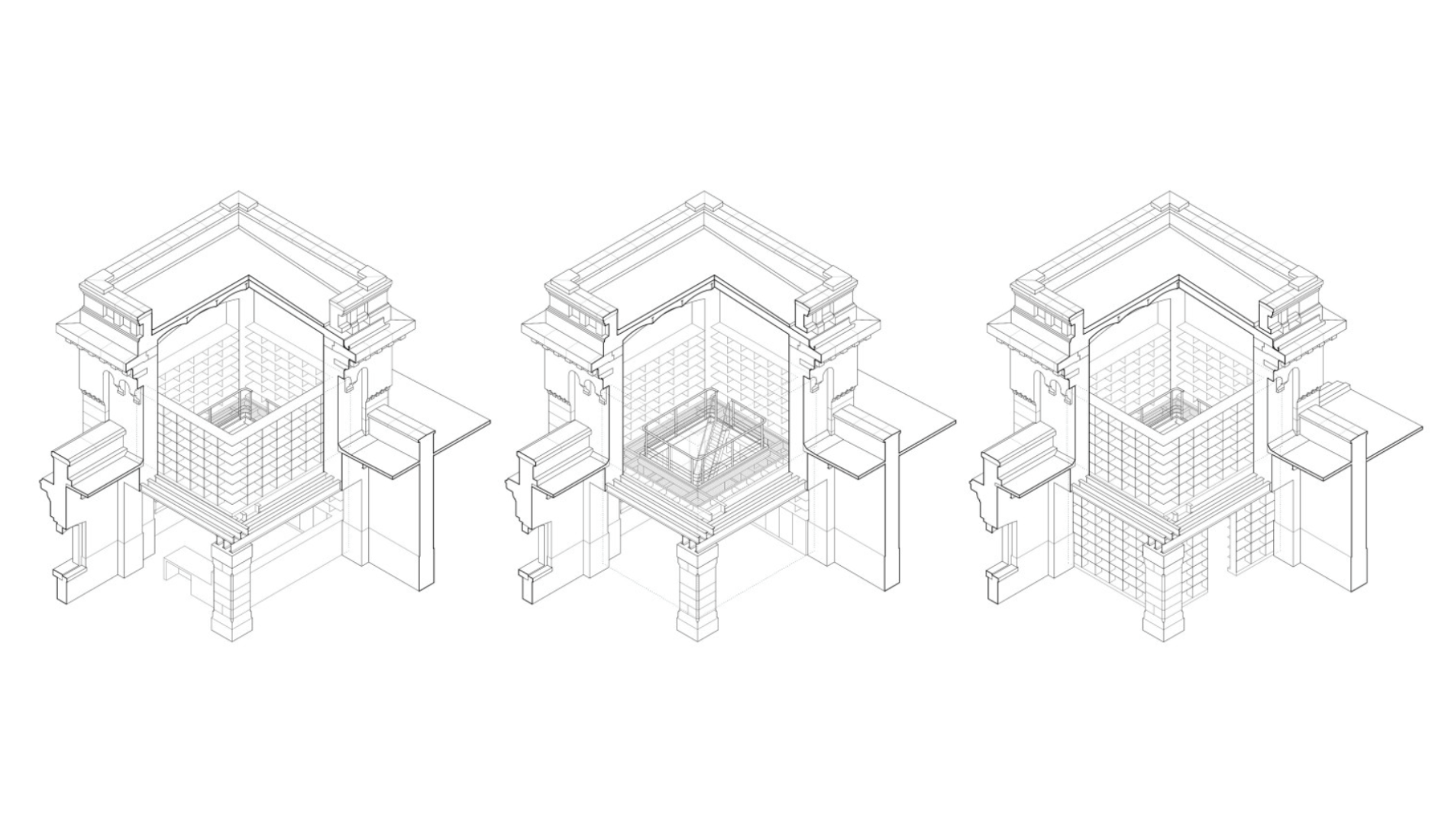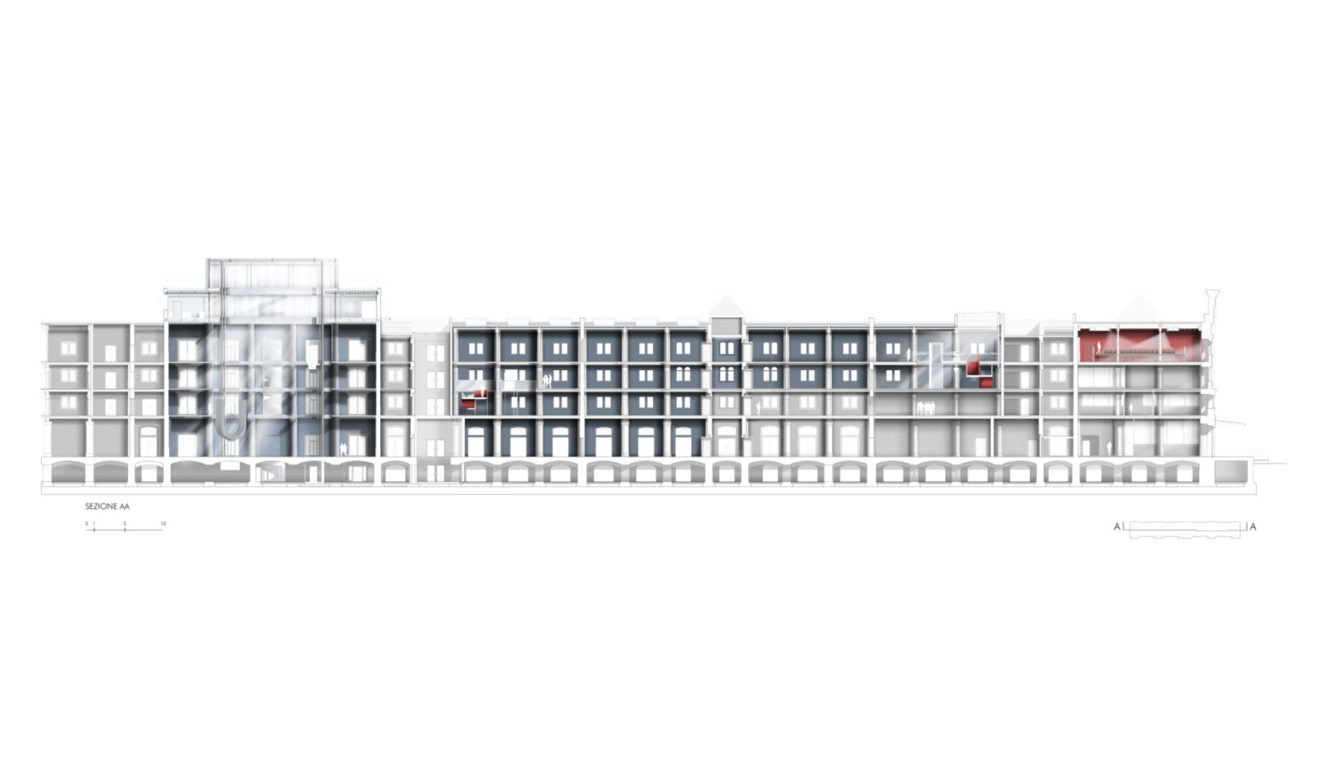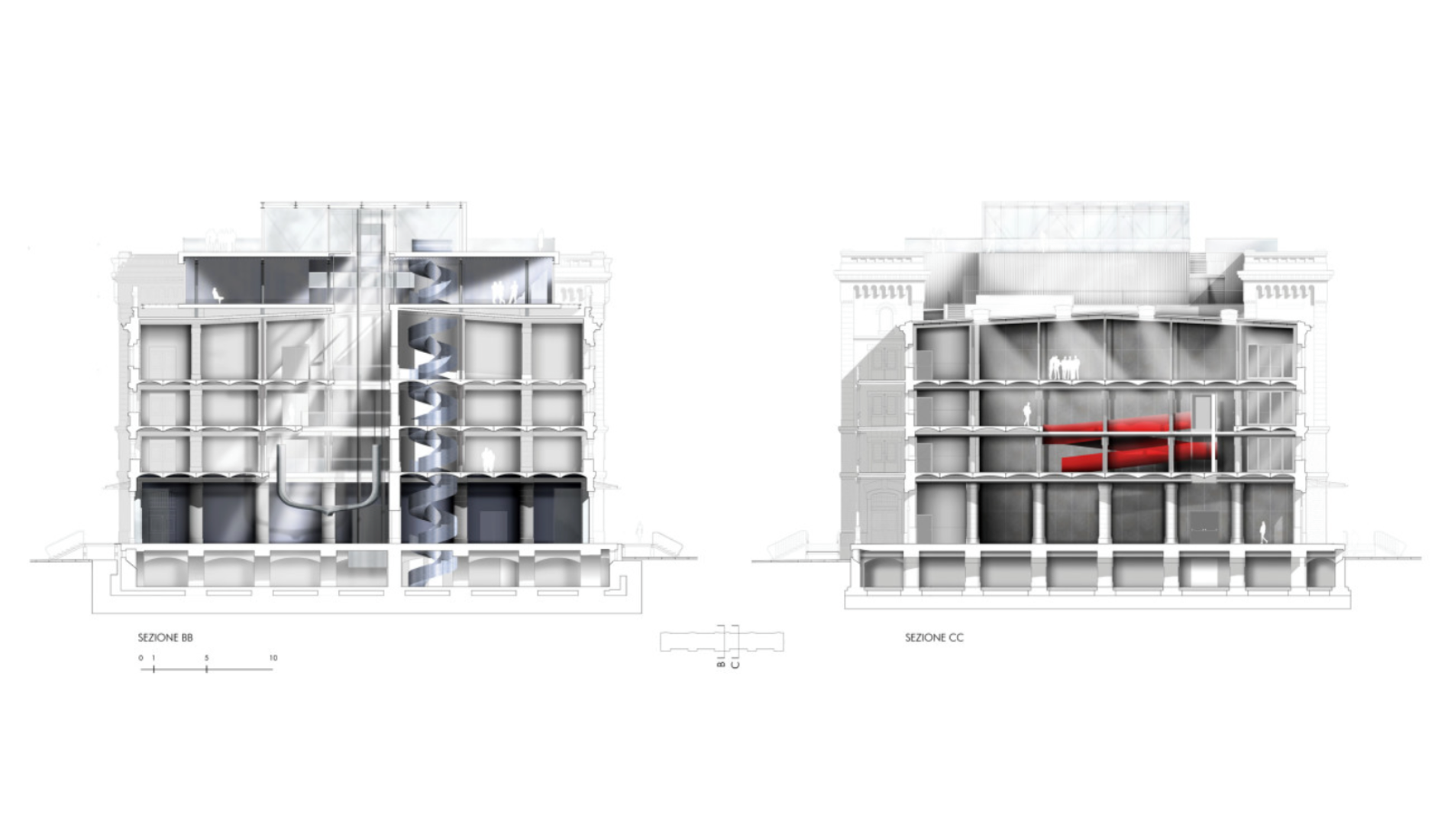 La relazione spaziale di continuità tra esterno ed interno, verrà estesa anche alla spazialità verticale tra i diversi livelli del museo, dal livello basale alla copertura, con la rimozione parziale di alcuni solai per permettere un sistema di prospettive e affacci sempre differenti sullo spazio centrale e garantire l’illuminazione naturale degli ambienti sottostanti grazie alla apertura di un nuovo lucernario.