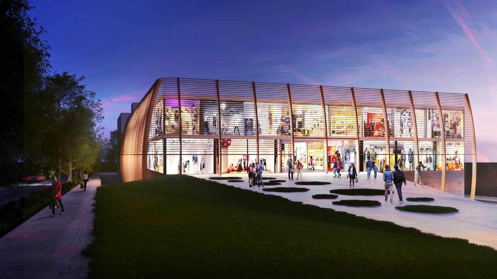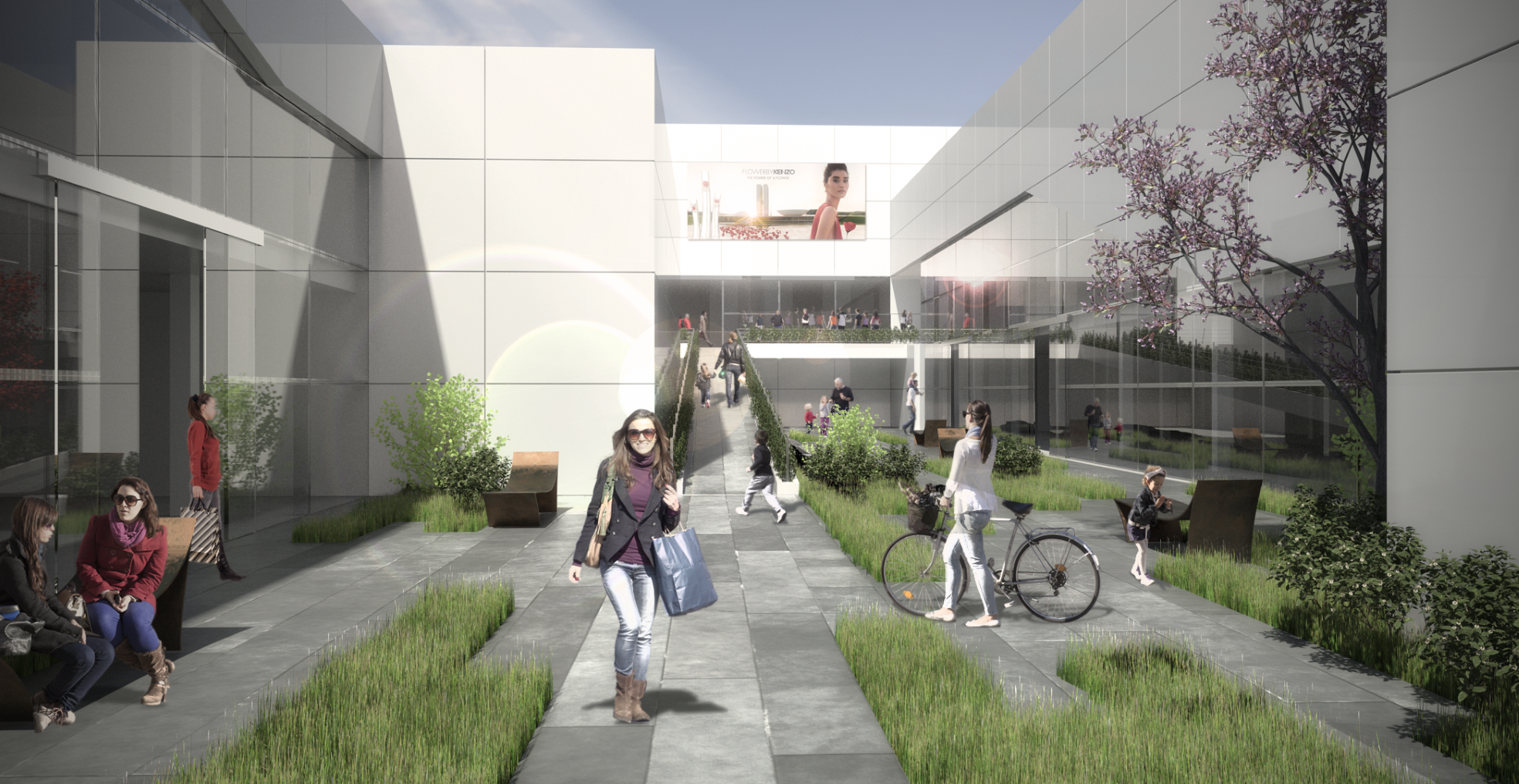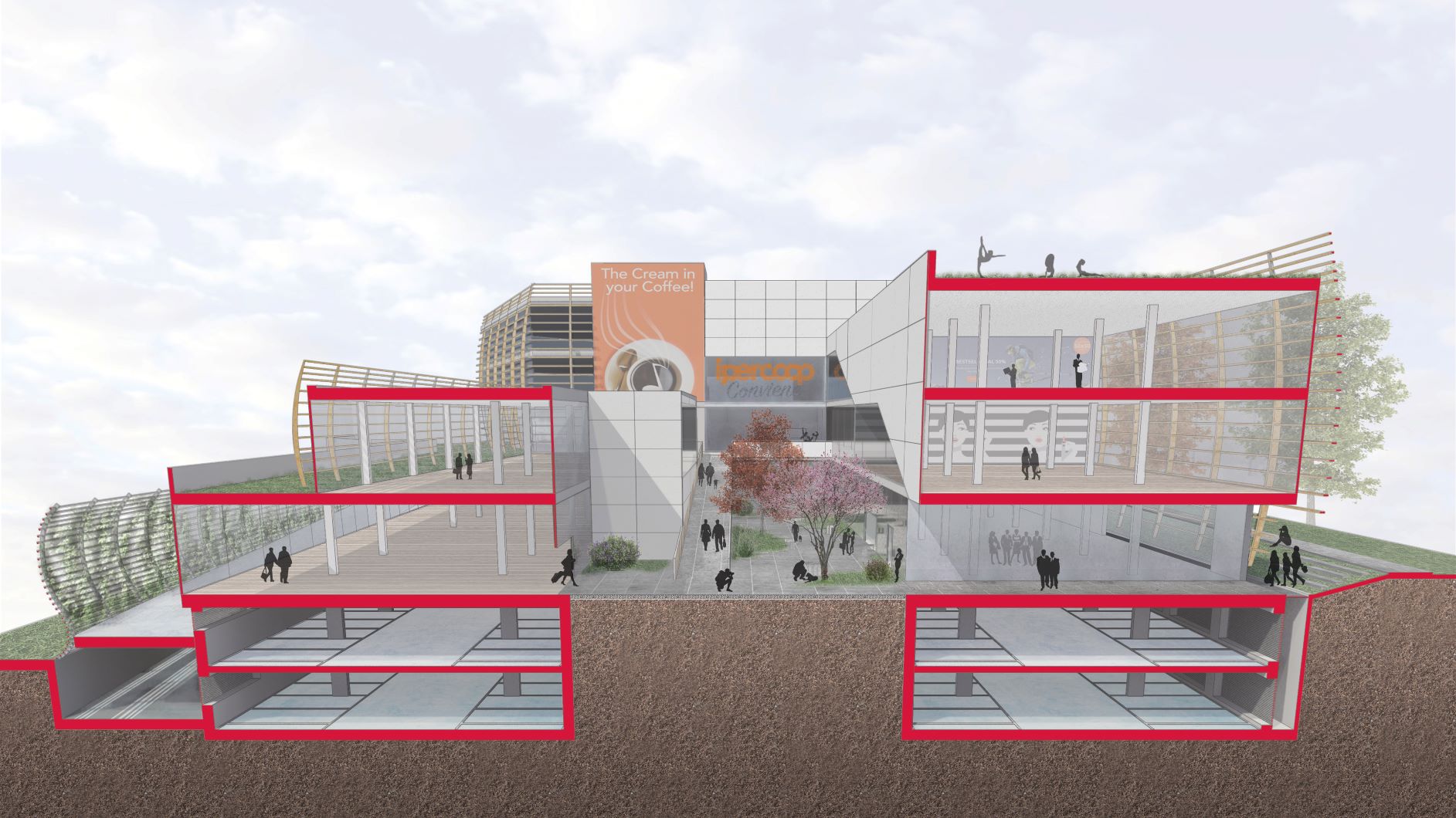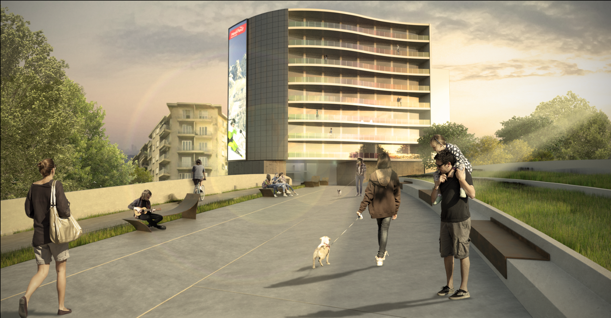 Sul fronte volumetrico, il progetto ha voluto privilegiare il frazionamento dei volumi commerciali valorizzandone la visibilità e la fluidità tra spazi interni ed esterni mentre ha reso i più importanti volumi residenziali e ricettivi addolciti da una facciata vetrata su profilo curvo e movimentati dalle diversità dei materiali utilizzati; ha voluto garantire l’autonomia funzionale dei singoli volumi fuori terra dotandoli di parcheggi interrati di pertinenza; ha enfatizzato l’ariosità dell’insieme rispetto al contesto cittadino circostante mediante spazi aperti posti a diverse quote e ad un circuito perimetrale alberato.