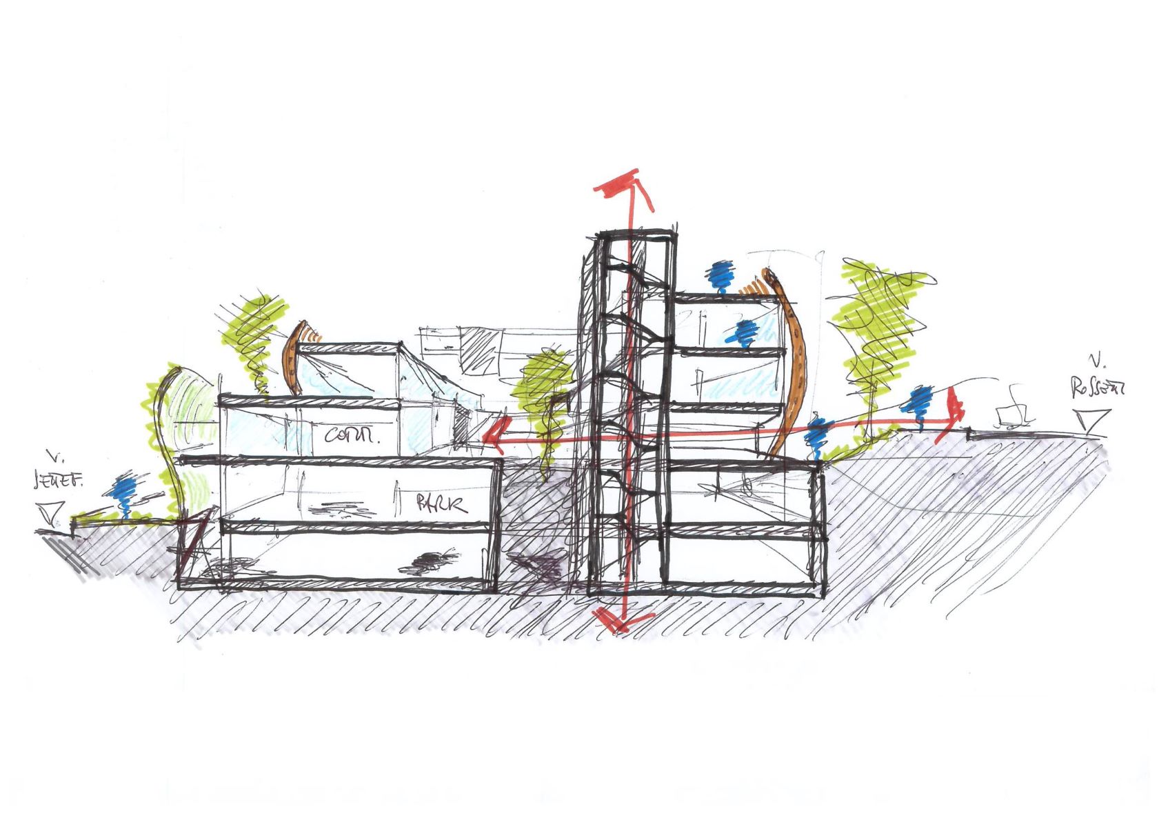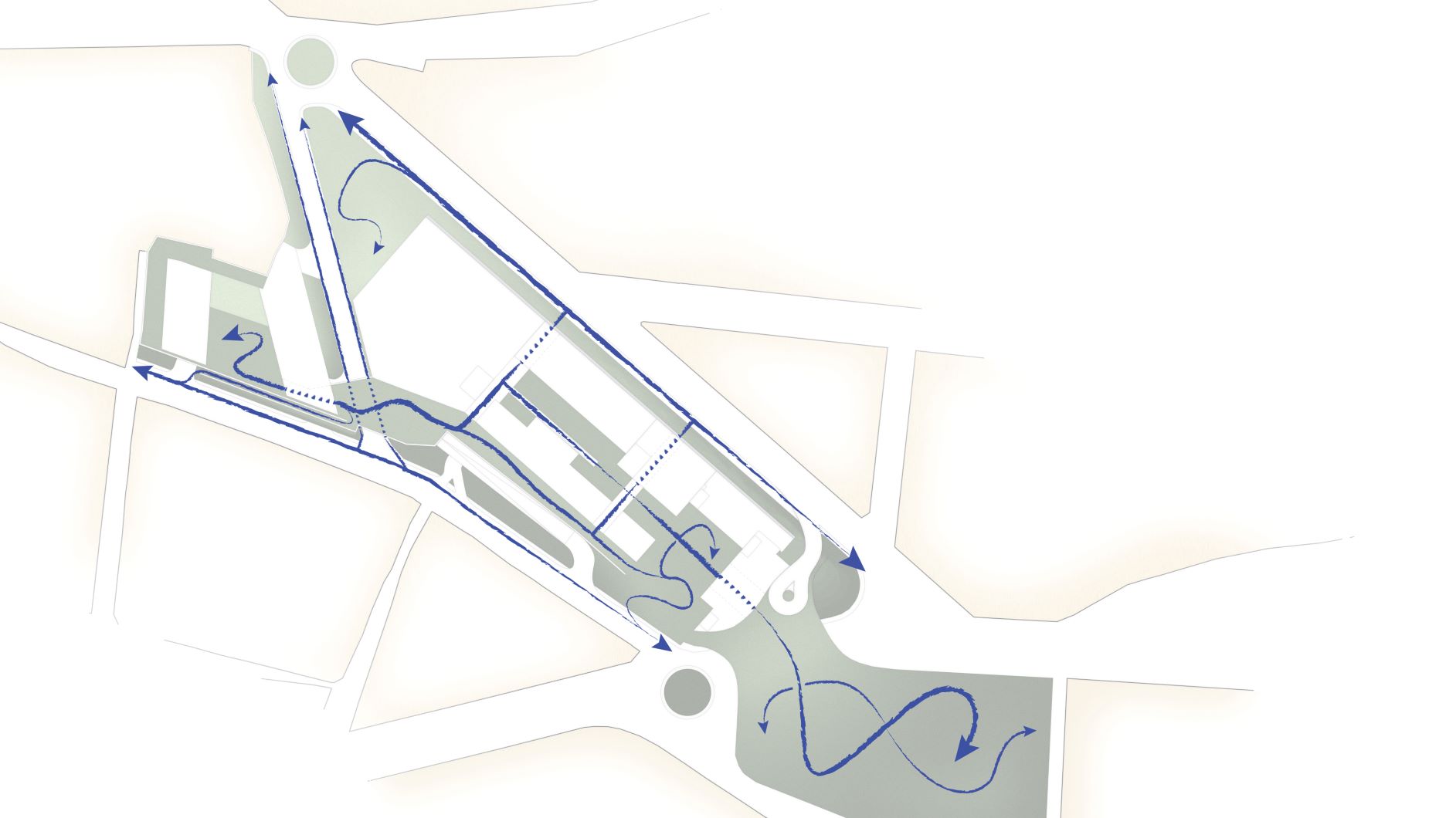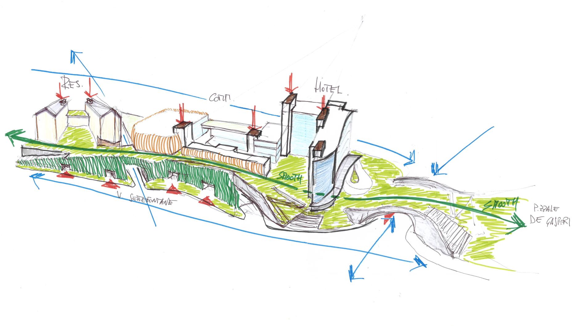 Coerentemente con gli strumenti previsti dal Piano Regolatore Generale del Comune di Trieste e con le richieste del Committente, Studio MADS ha idealmente suddiviso l’area in tre lotti di intervento con funzioni separate – alberghiero, commerciale e residenziale – accessibili dalla viabilità urbana, da un nuovo sovrappasso e da attraversamenti pedonali longitudinali e trasversali.