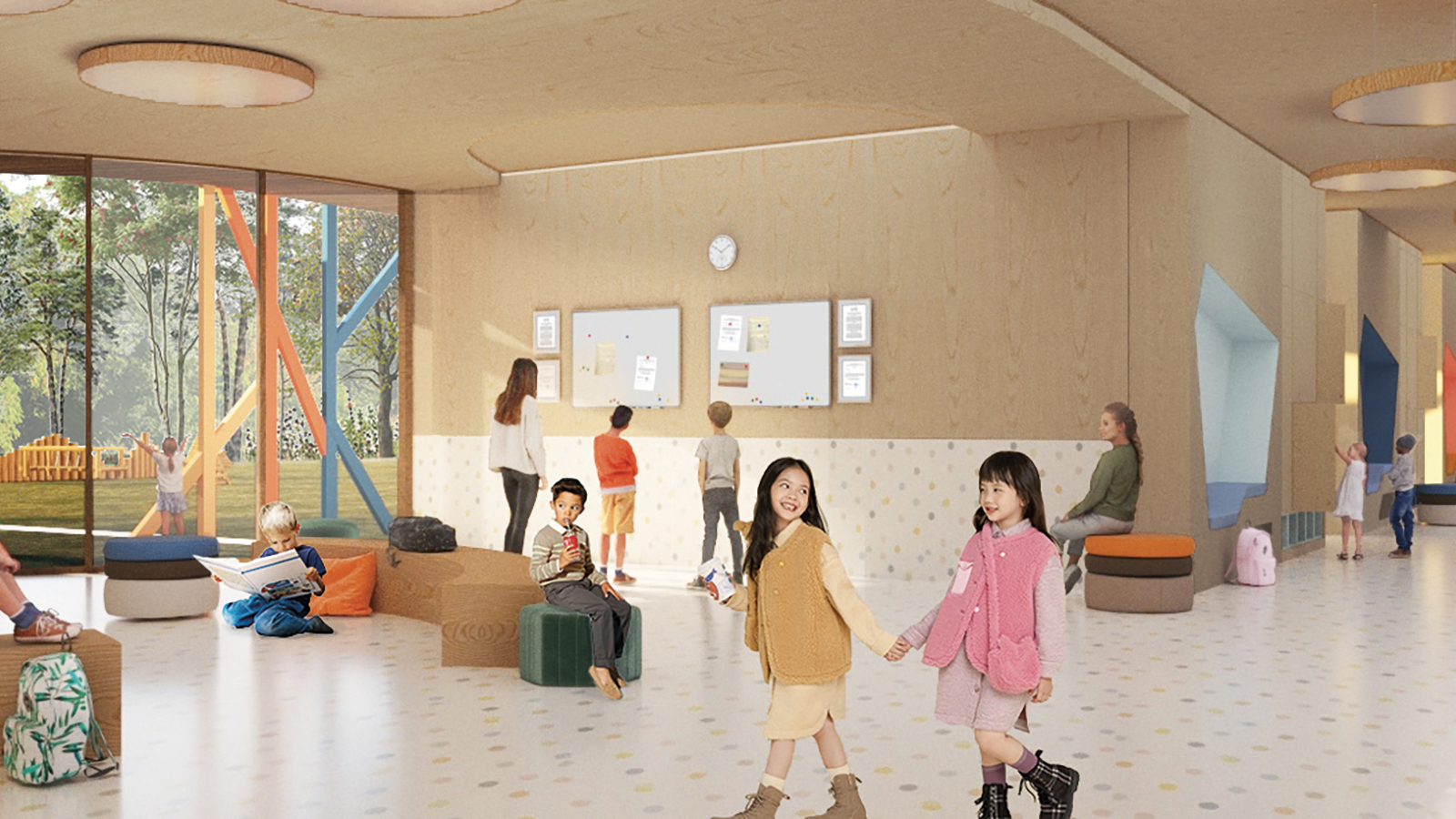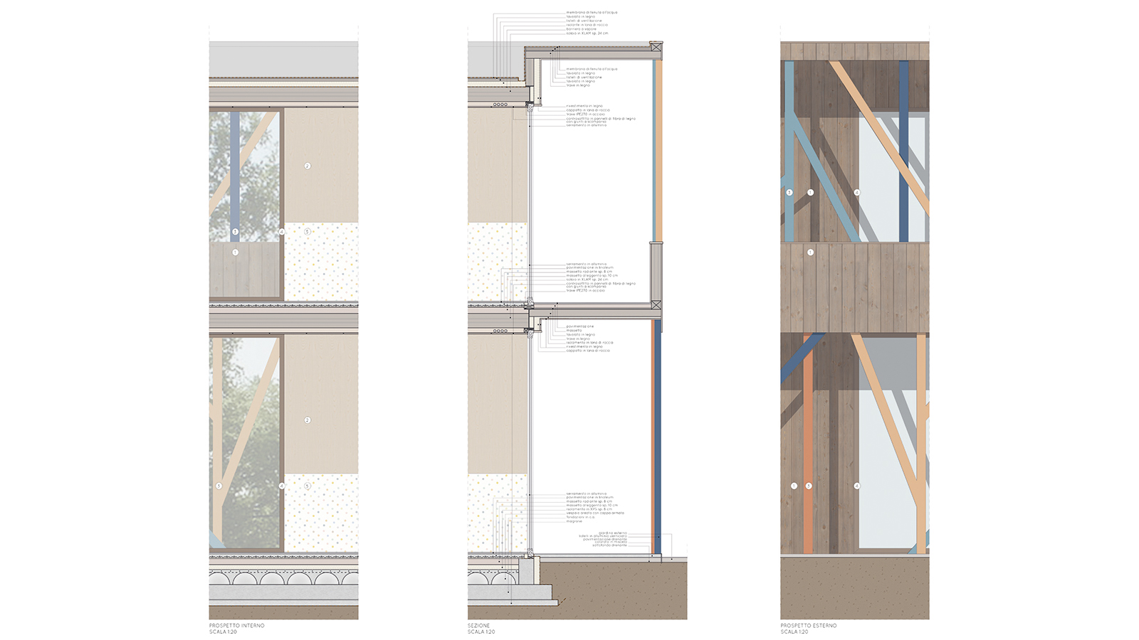 Il progetto pone particolare attenzione agli ambienti interni che lo definiscono, massimizzandone l’uso e limitando al minimo gli sprechi di spazio, rispettando così il vincolo di consumo di suolo che prevede un incremento massimo del 5% rispetto alla scuola esistente. La progettazione ha dunque portato ad un volume permeabile, con spazi ibridi di gioco, didattica e uso comune, aperto verso l’esterno, con la quasi totale assenza di tessuto connettivo superfluo. Nella progettazione sono stati seguiti i criteri della bioedilizia, al fine di garantire la miglior sostenibilità ambientale lungo tutto il ciclo di vita dell’opera e ottimi risultati in termini di comfort ambientale e riduzione delle emissioni. Seguendo questa logica l’intervento prevede che l’intero complesso di nuova realizzazione sia definito da una struttura in legno mista, caratterizzata dall’uso di pareti in x-lam e solai con travi in legno lamellare e doppio tavolato. Il progetto nasce dalla volontà di creare un luogo identitario, che possa instaurare relazioni e mediazioni tra il quartiere e la scuola. A questo fine è nata l’idea di una piazza sul fronte principale di Via Piave, un primo luogo d’incontro dei bambini e di attesa dei genitori, che si rapporta in modo diretto con il contesto urbano. Questo spazio è disegnato dalla conformazione del nuovo volume che si pone come un “invito” alle nuove generazioni che entrano nella scuola e allo stesso tempo un “abbraccio” alla comunità. Il sistema di piazze continua poi negli spazi più privati della scuola, definendo situazioni e relazioni differenti, in particolare con una piazza interna che fa da fulcro per lo sviluppo degli ambienti ed una esterna che si rapporta con il giardino e il percorso verde che si sviluppa fino al primo piano. Oltre alla definizione di un carattere identitario altri aspetti importanti che sono stati considerati nella realizzazione del progetto sono legati al ruolo della didattica e delle esigenze dei più piccoli, l’ambiente deve essere favorevole a stimolare l’apprendimento e gli aspetti cognitivi e creativi. Il progetto parte dall’involucro esterno, trattato con materiali naturali combinati con cromie vivaci e prosegue all’interno, sviluppandosi su due piani fuori terra per minimizzare il consumo di suolo, attraverso l’organizzazione di ambienti che giocano tra flessibilità e apertura. Altro tema riguarda la relazione con il blocco palestra esistente di cui si era vincolati al mantenimento, il quale si relaziona con il nuovo edificio in modo discreto. Nel complesso la volontà progettuale ha creato un’immagine integrata, identitaria ma soprattutto accogliente e attrattiva per i piccoli utenti della scuola.